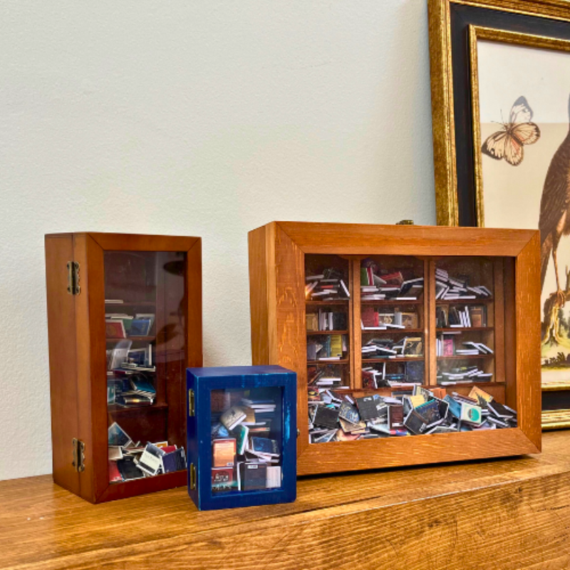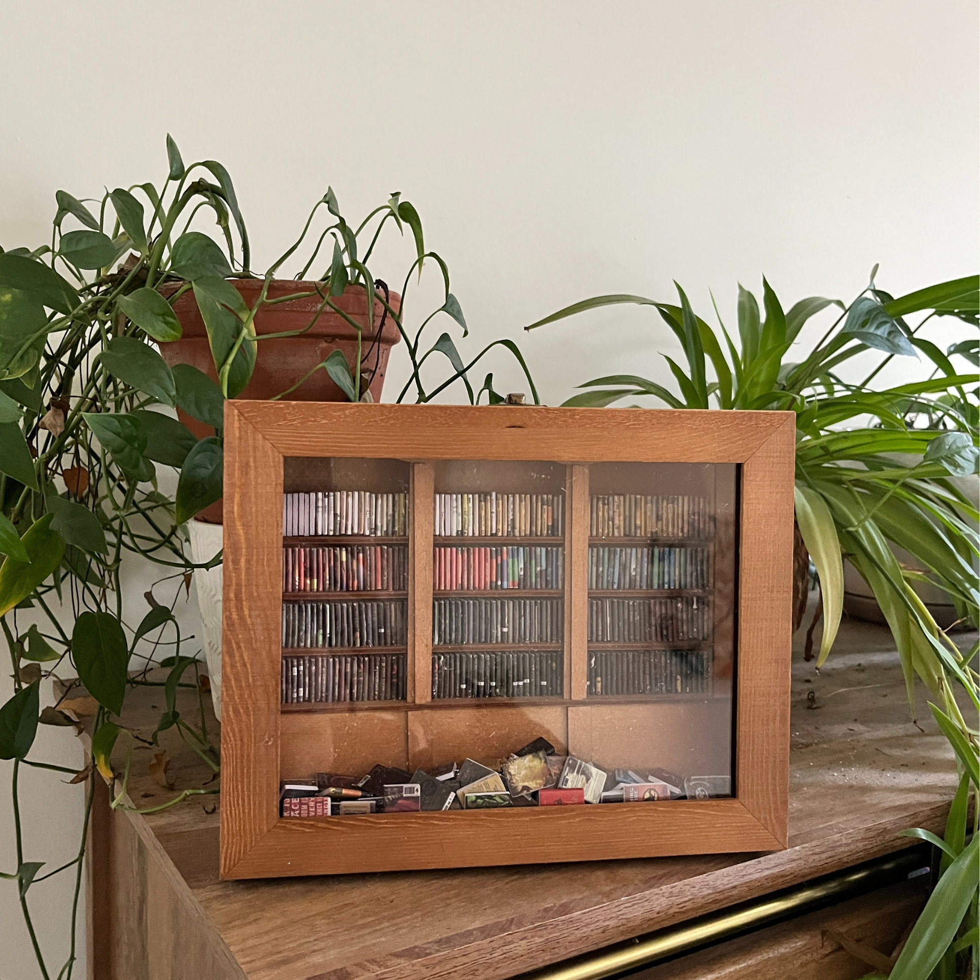Kézzel készített fából készült könyvespolcunk kielégítő módja a szorongás oldásának. Miután elrakta a minikönyveket, csukja be a vitrint és fordítsa el a reteszt. Ha a stressz visszatér, egyszerűen rázza fel a könyvespolcot, hogy minden összekeveredjen, és kezdje elölről :)